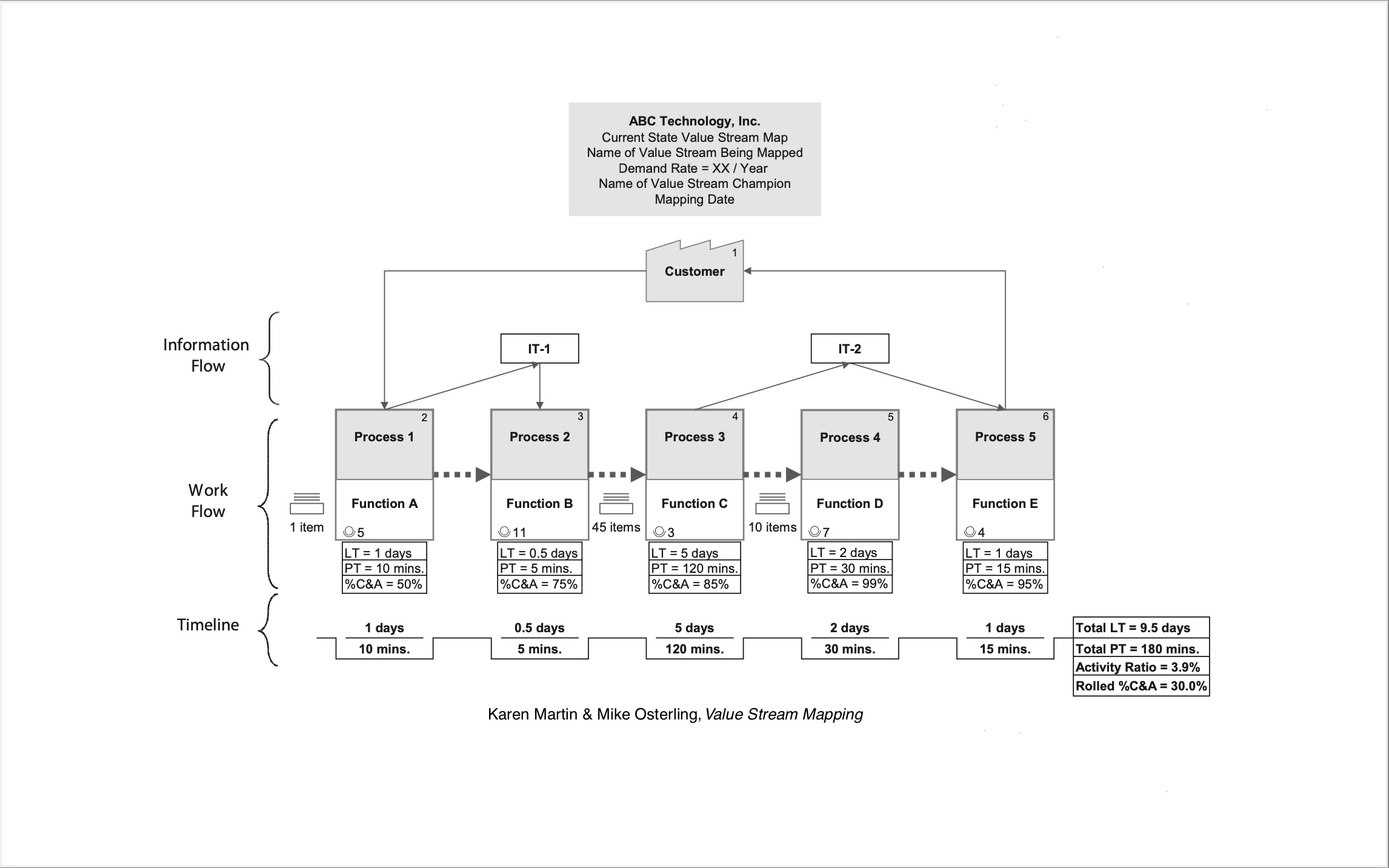 Being derived from Lean Manufacturing, VSM visually represents the way value flows through an organization from the time a customer requests a good/service, until the time a customer receives the good/service. This practice can be particularly effective at: